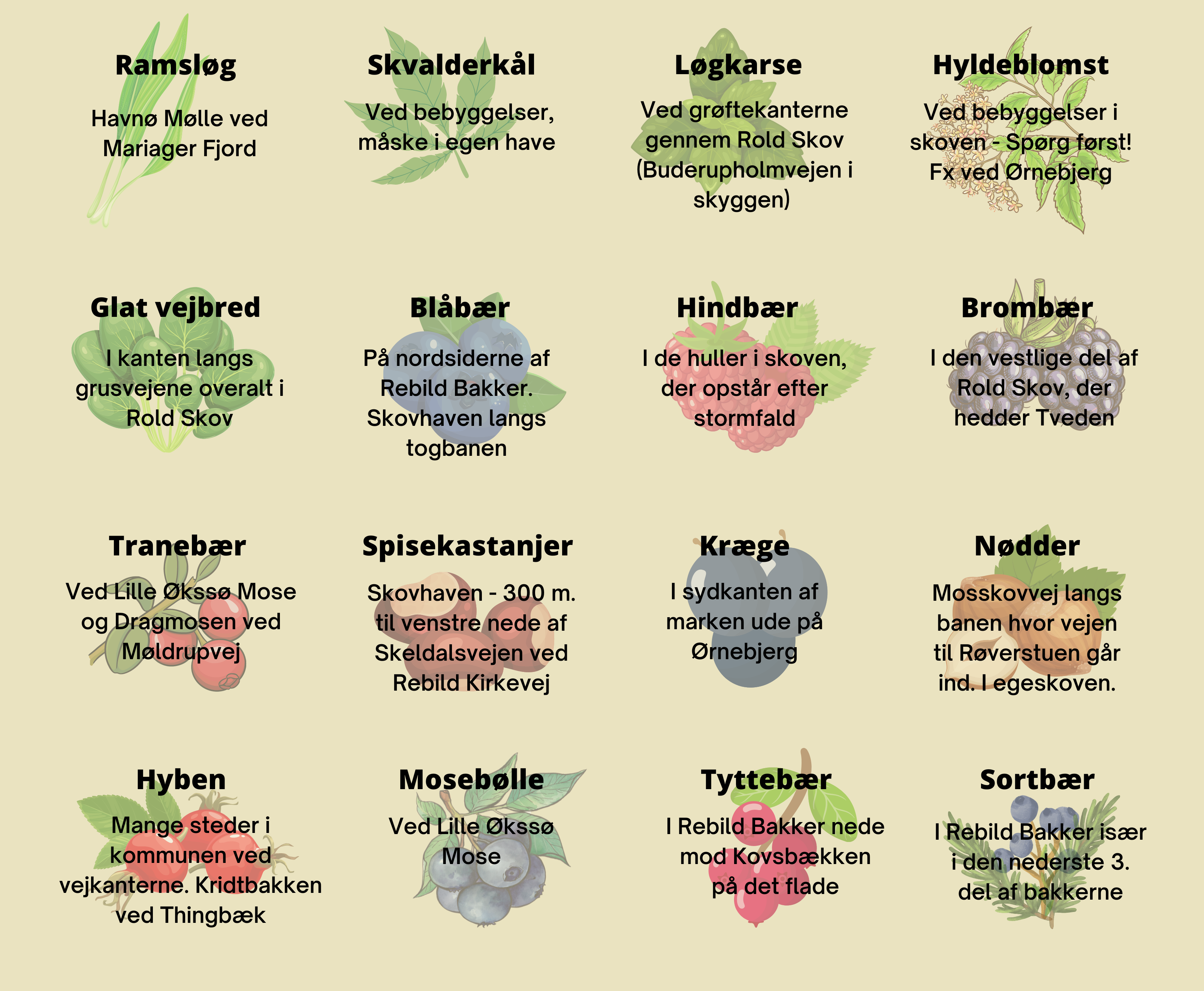 I ’Min Naturbog’ har vi præsenteret nogle forskellige bær, urter og nødder, som du særligt vil have mulighed for at finde forskellige steder i Rebild Kommune. Der har vi også vist i hvilke måneder, du særligt vil kunne finde maden. Men spørgsmålet er hvorhenne i kommunen, du har god chance for at finde maden.